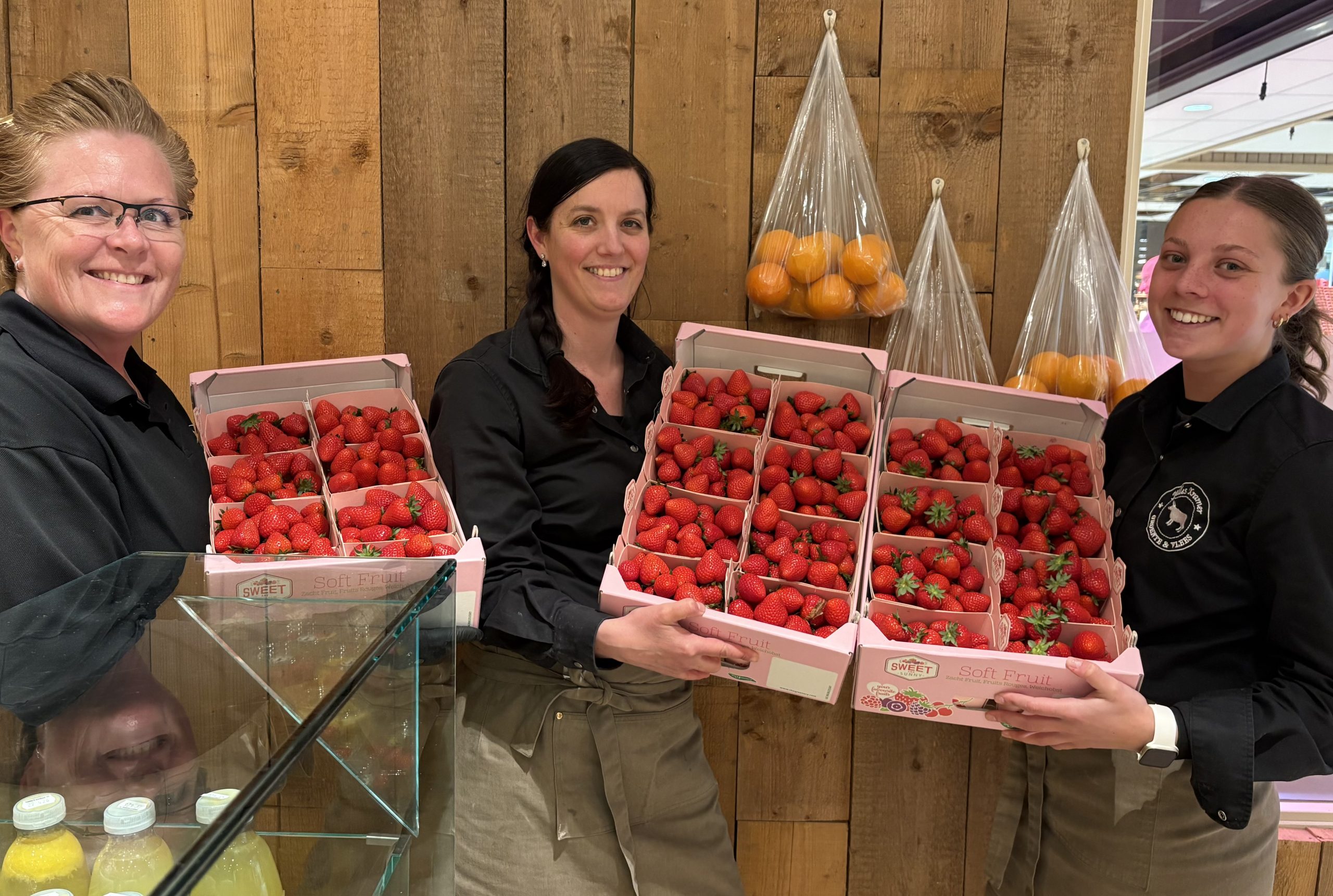 Op de foto ziet u Astrid, Judith en Emma pronken met de aardbeien. Wist u dat wij een groot assortiment maaltijden in onze winkel hebben? Zo’n 18 verschillende maaltijden om op te warmen, en daarnaast ook soepen uit eigen keuken zoals kippensoep en aspergesoep, pinsa’s en heerlijke maaltijdsalades.